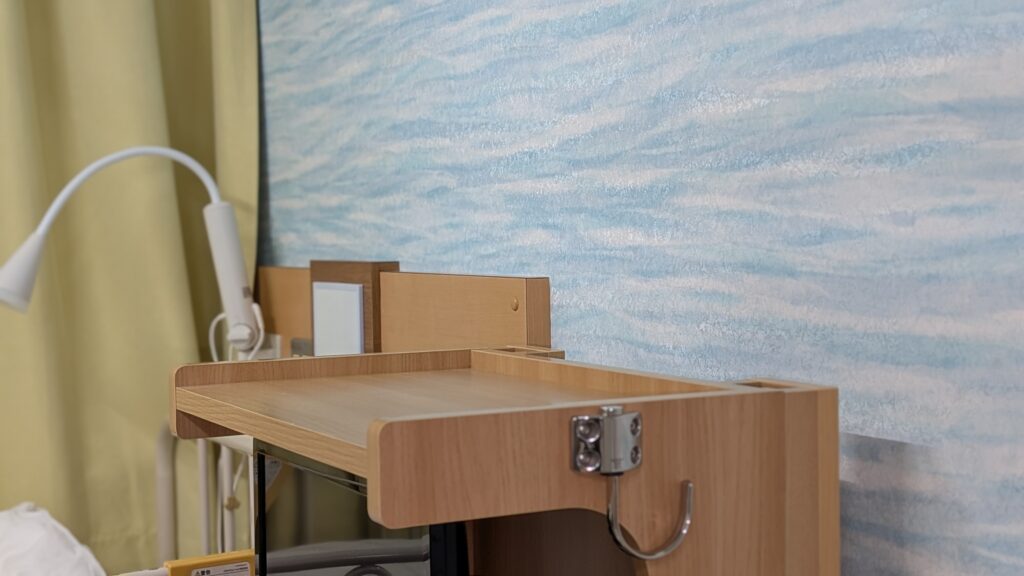 はい。ベッドは患者さんの怪我の状態や好みに応じて左右どちらにも配置できるようにしています。また、間仕切り家具やU字型カーテンを使い分けることで、プライバシーを確保しながら“自分だけの空間”を作れるようにしました。壁だけでなく、家具やカーテンが揃って初めてデザインの全体像が見えるんです。